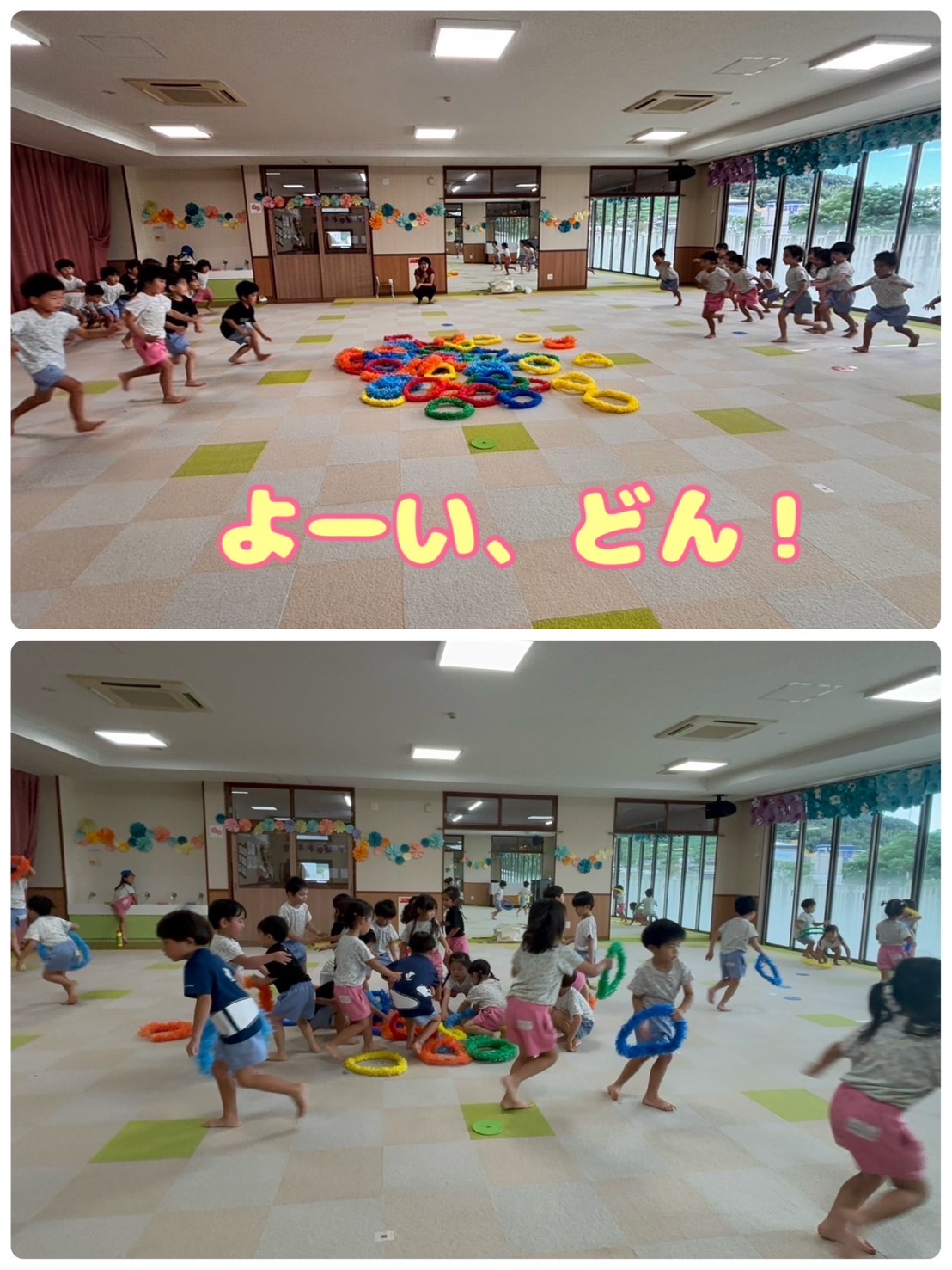 自分の色を目指して走っていく子どもたち、自分の場所に戻ると「やったー!」と