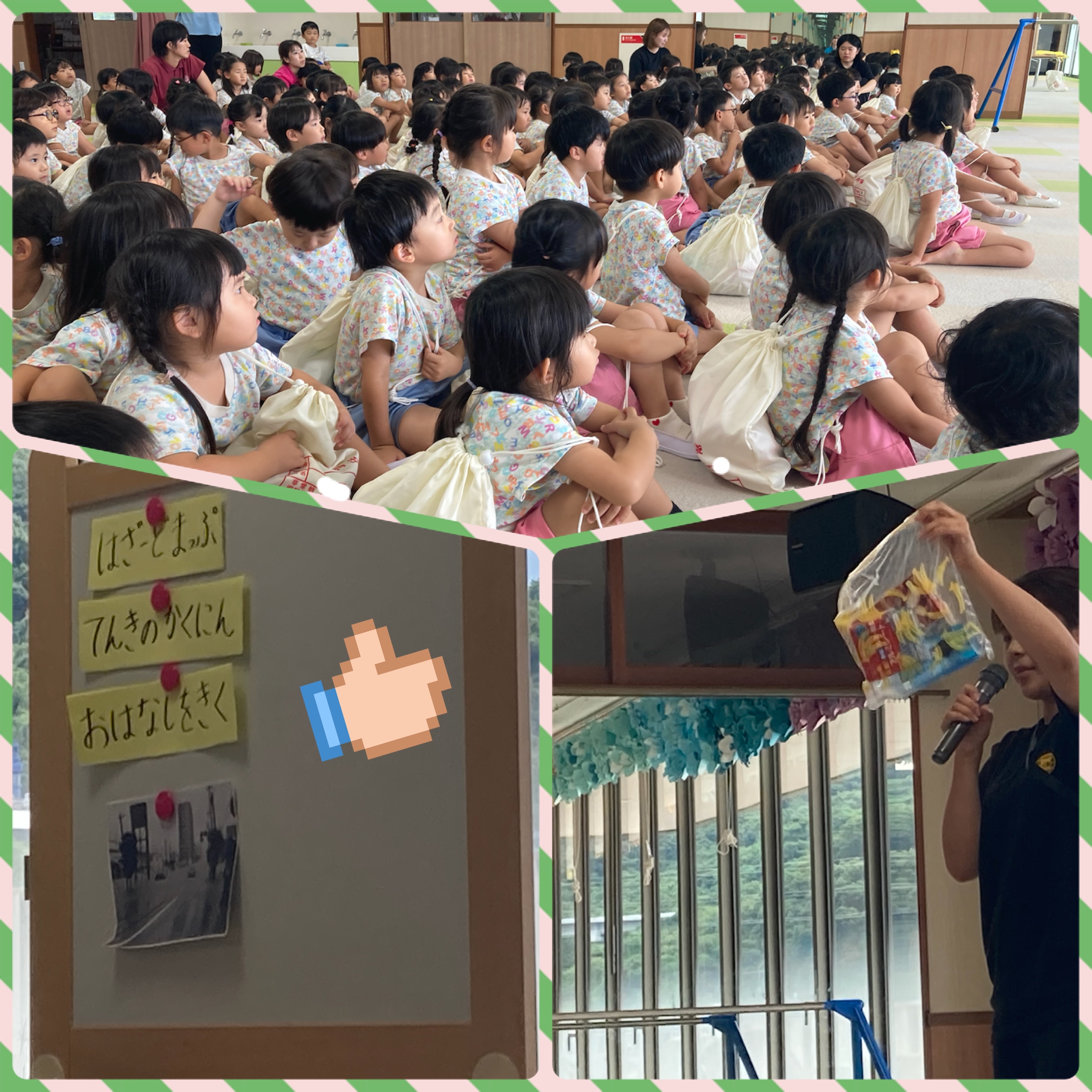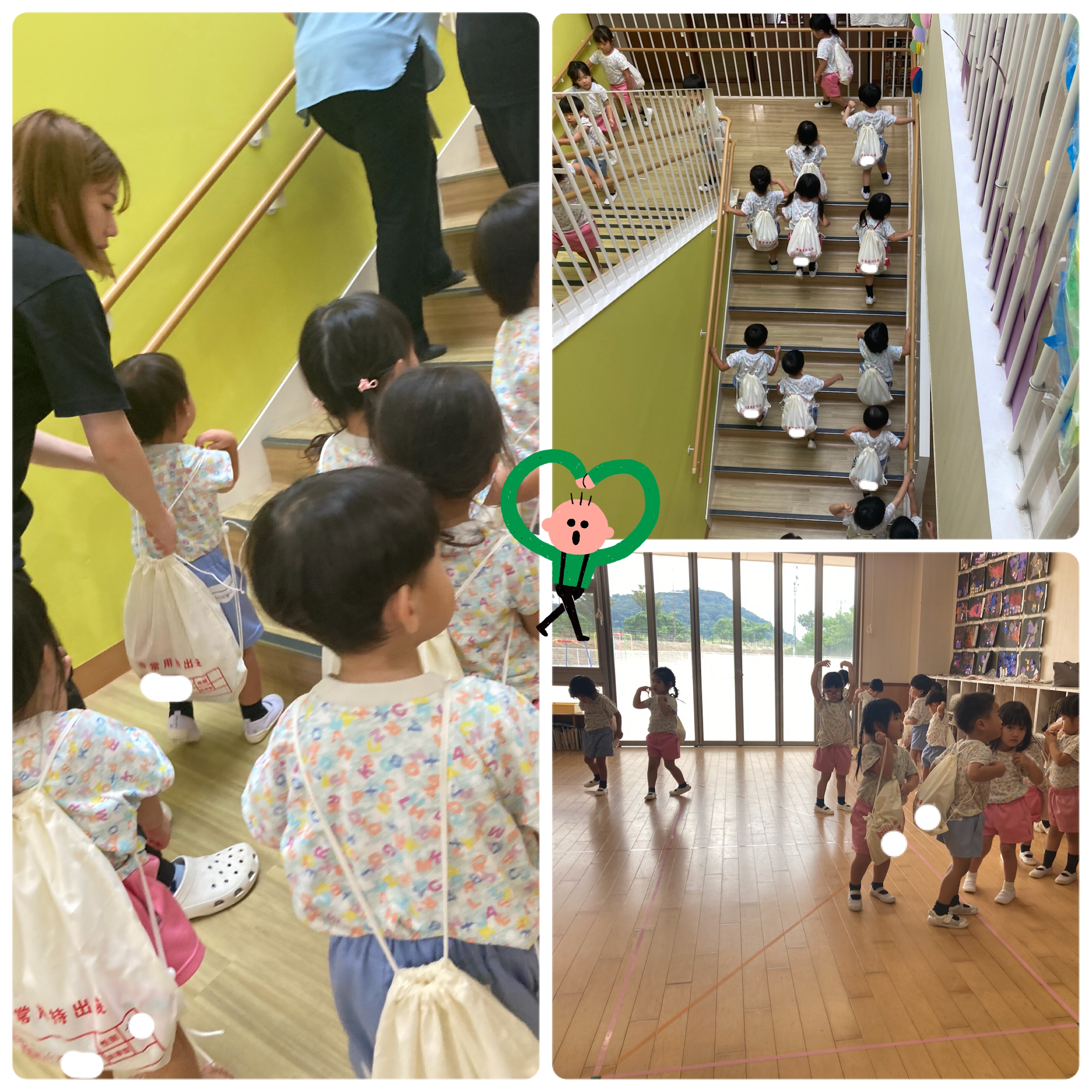 火災の避難訓練とは違い、2階のホールに避難する意味をしっかり理解できた子どもたちでした。