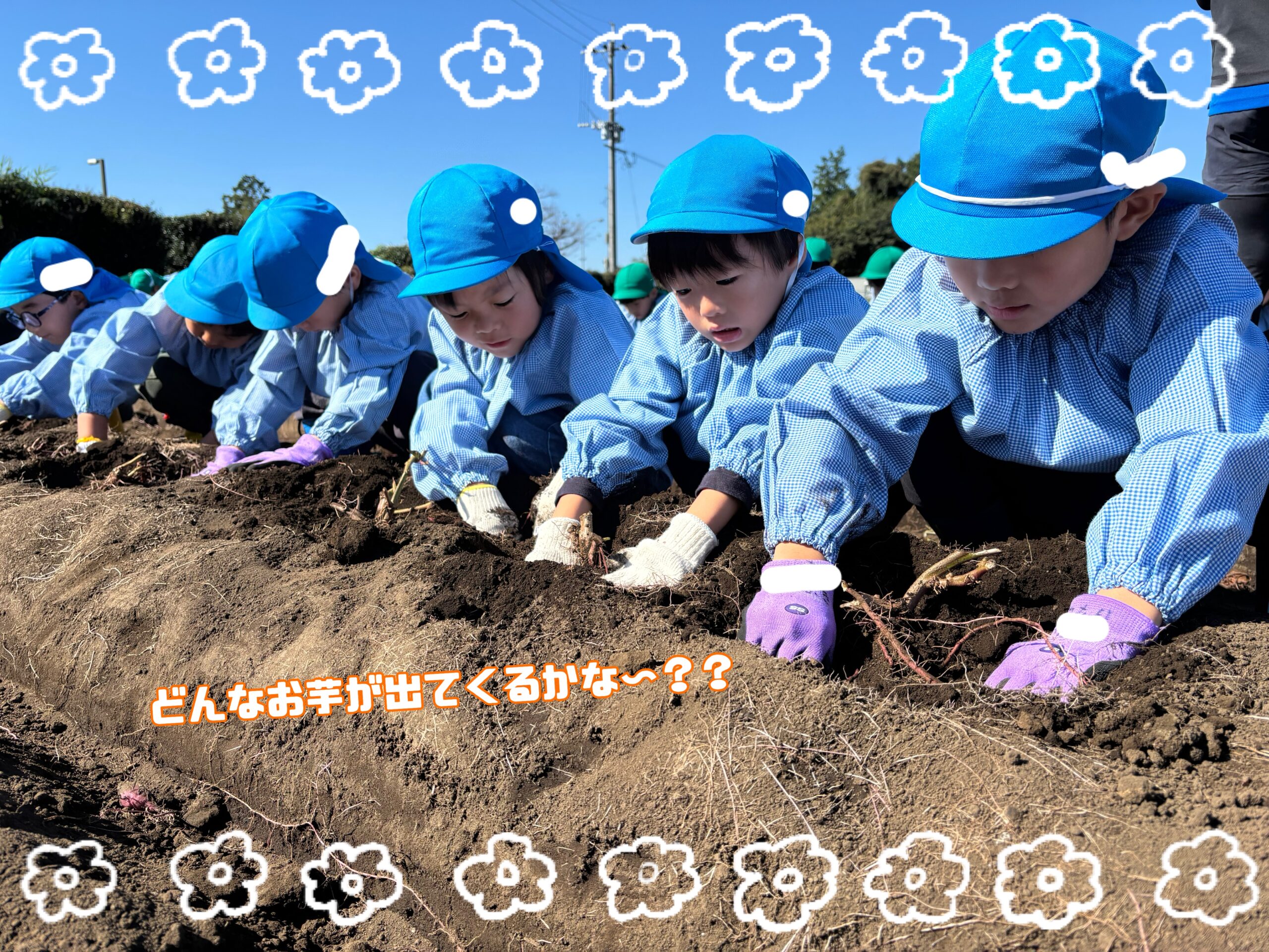 4列の畝のお芋を年長さん全員で協力して、あっという間に掘り出すことができました。