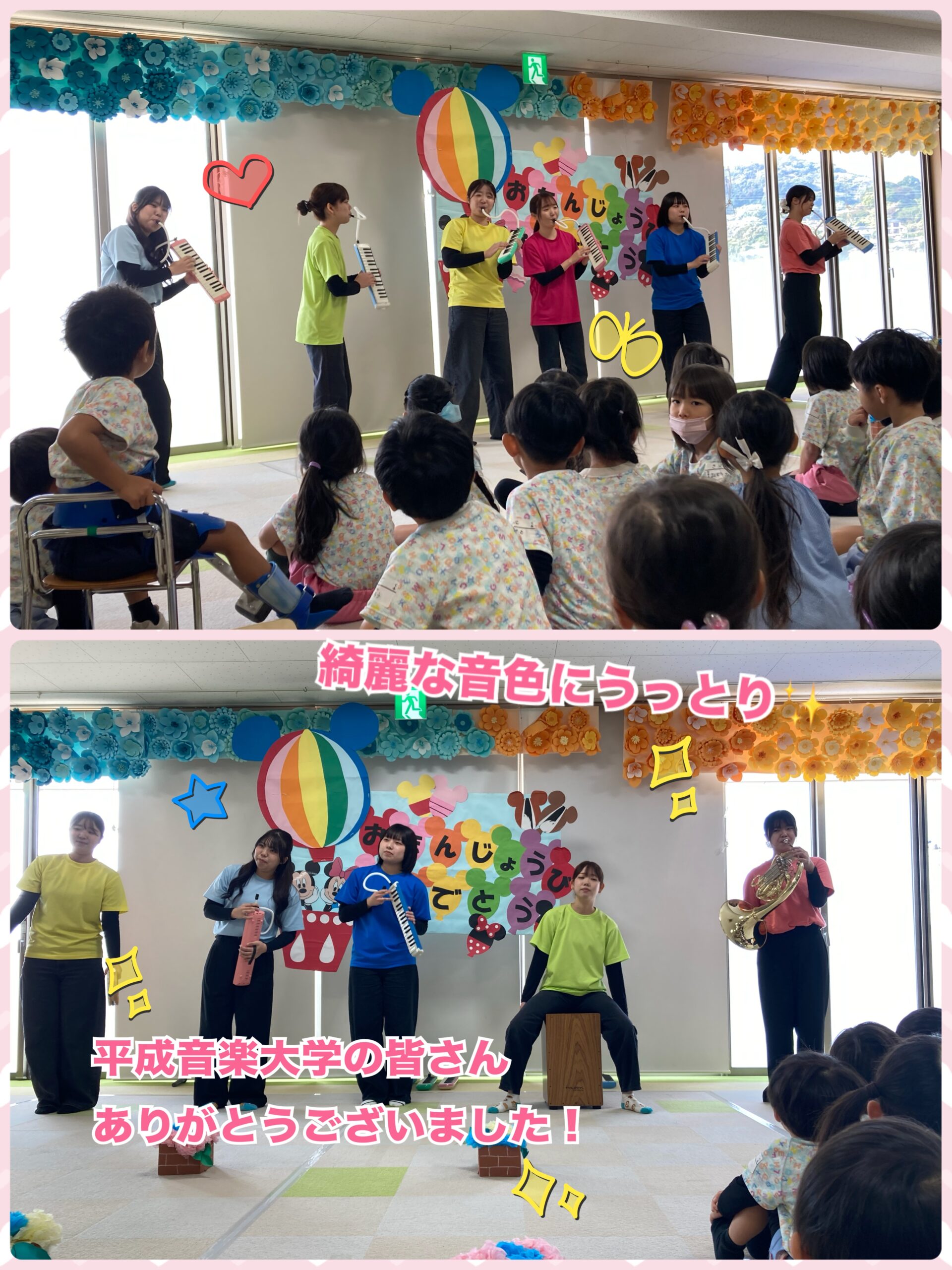 お休みのお友だちが多い中でのお誕生会で、学生さんの合奏や歌声を皆んなに届けたかったです。また、皆んなが元気に揃った時に来ていただきたいですね。平成音楽大学のお姉さん、お兄さんありがとうございました。