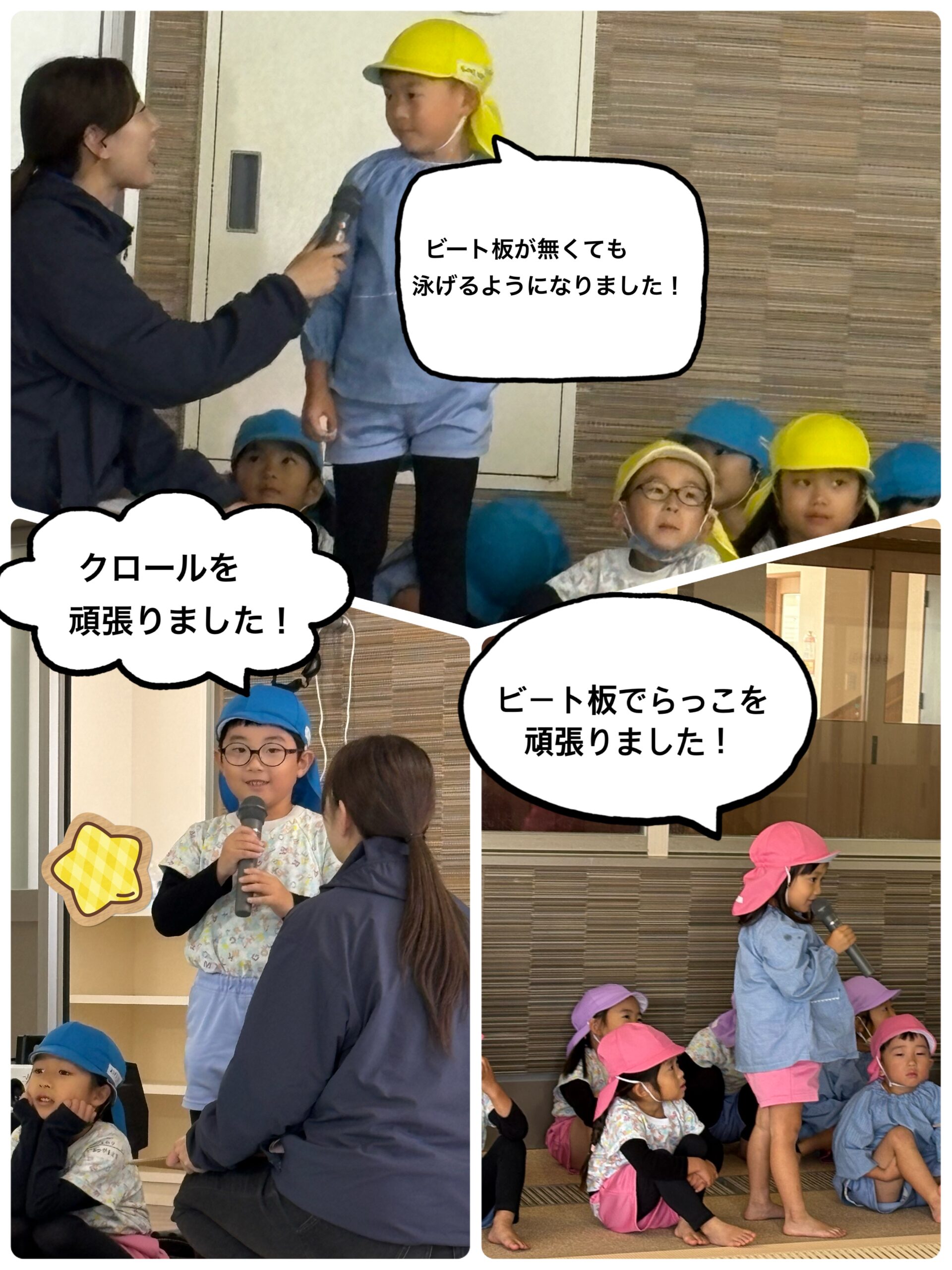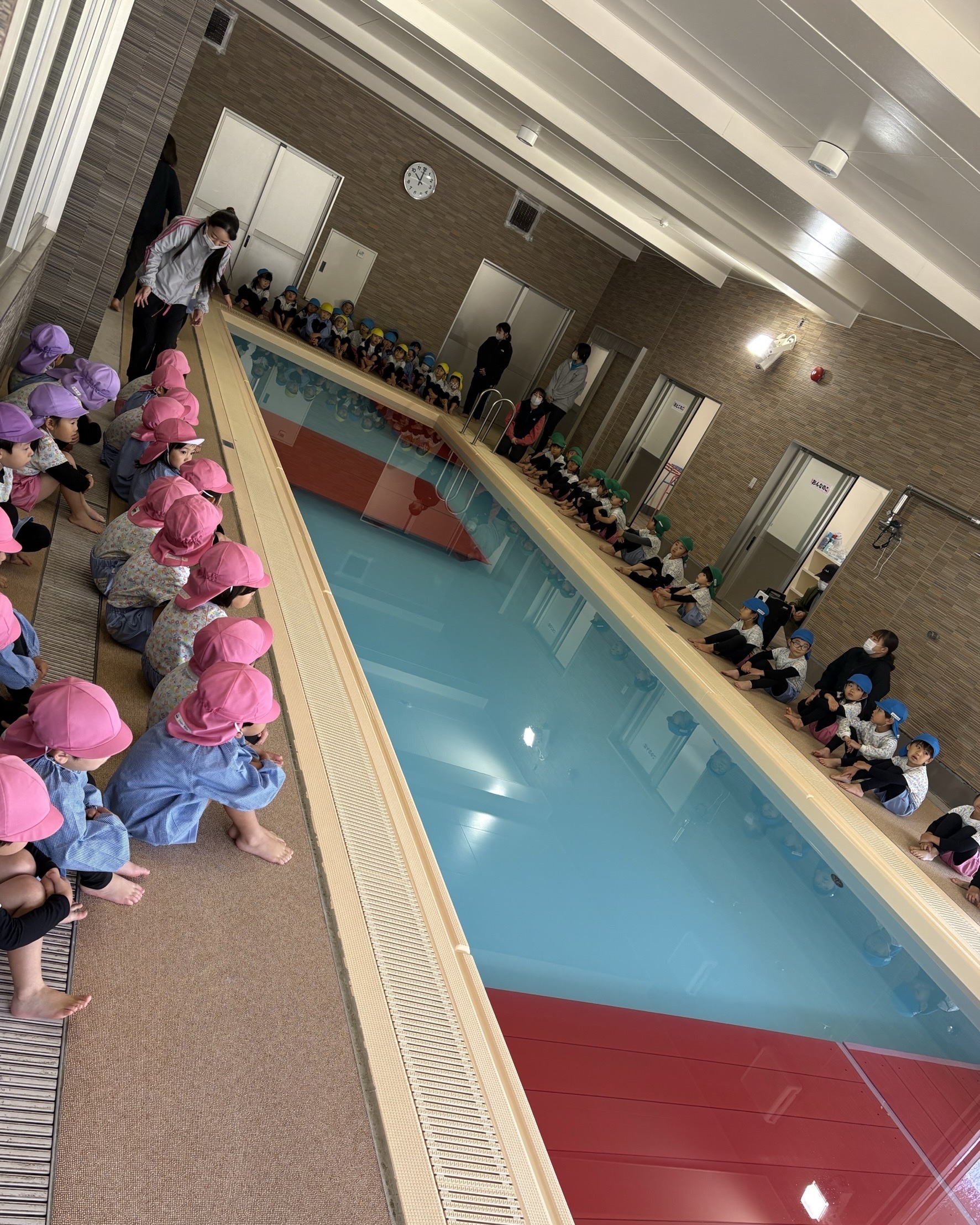年長さんは来年、小学校の大きなプールが待っていますね。幼稚園でプールが大好きになったお友だちばかりです。お水と仲良くなれたのも、みんながプールの時のお約束を守ることができたからですよ👏来年もみんなで楽しく入水しましょうね。