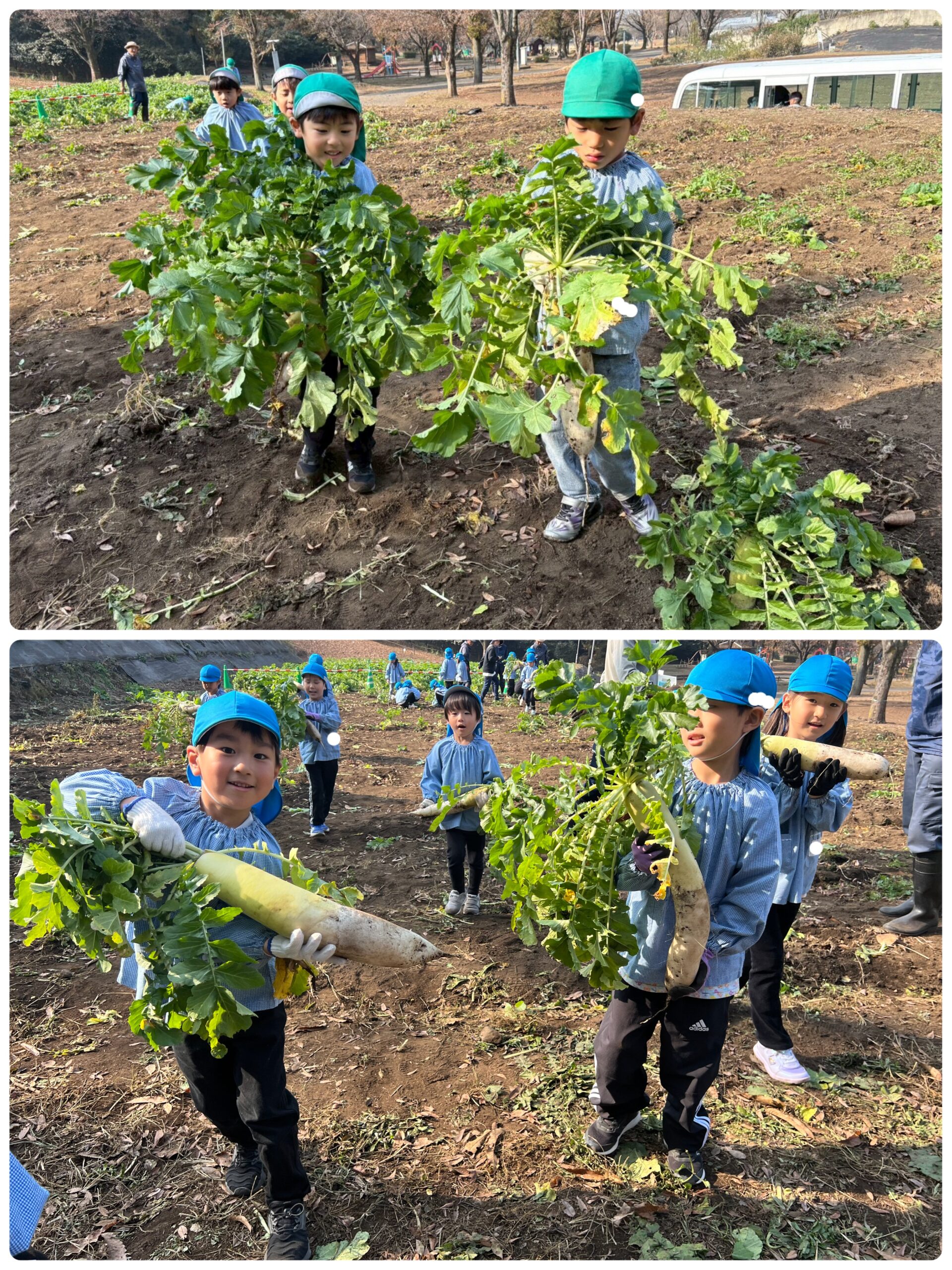 初めは「かたい・・」と苦戦していたお友だちも、カントリーパークの方々にお手伝いしていただき、大きな大根を掘ることができとても嬉しかったようです。