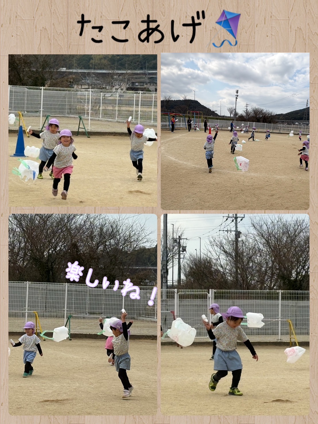 凧を空高くまで上げようと、園庭の隅から隅まで駆け回って遊びました😊