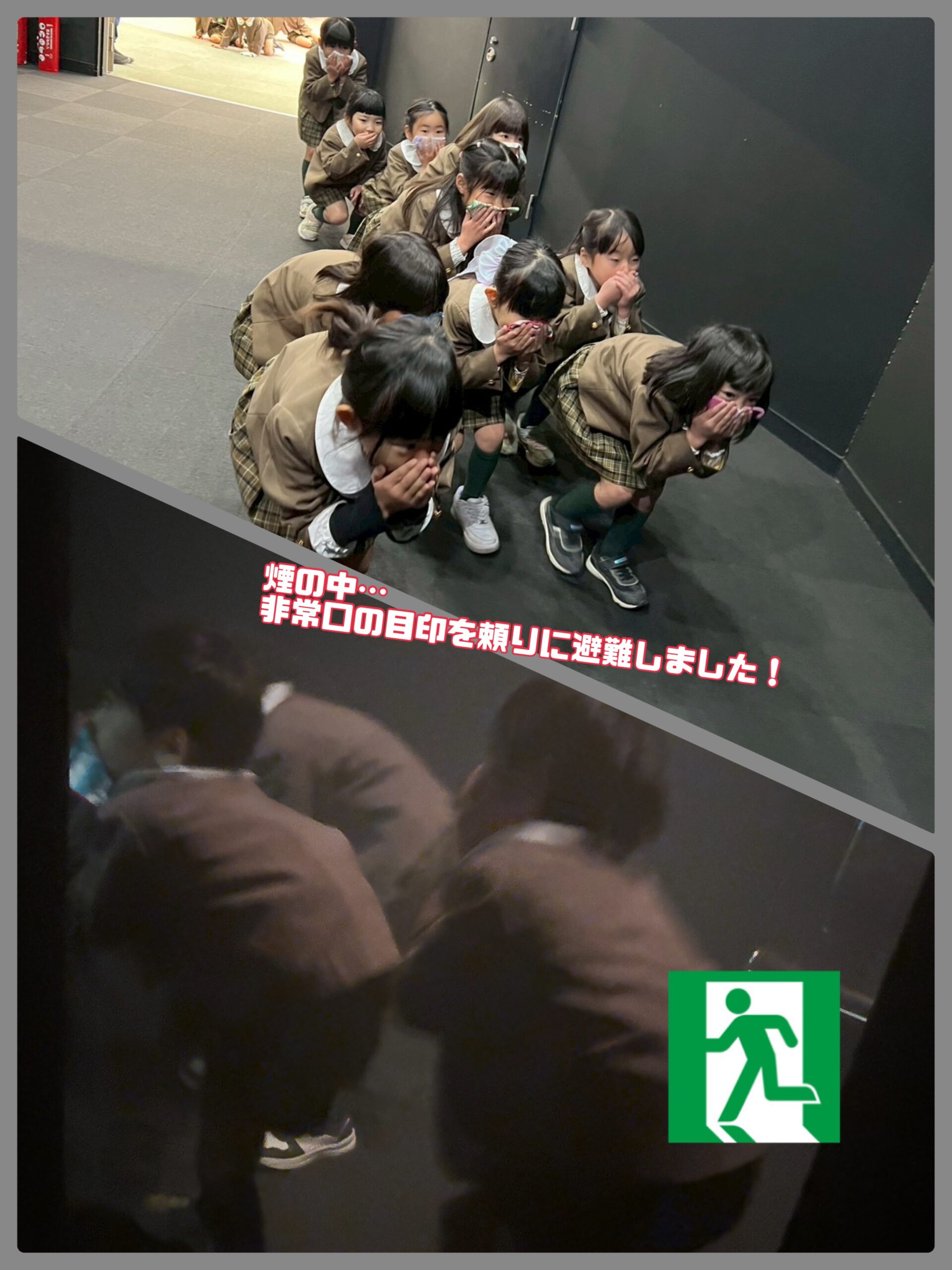 火災では、暗い部屋に入り緑の非常口マークに向かって歩きます。緊張感もありましたが、終わった後、煙の臭いが「プリンの甘い匂いがした」と楽しく話す様子が見られました。