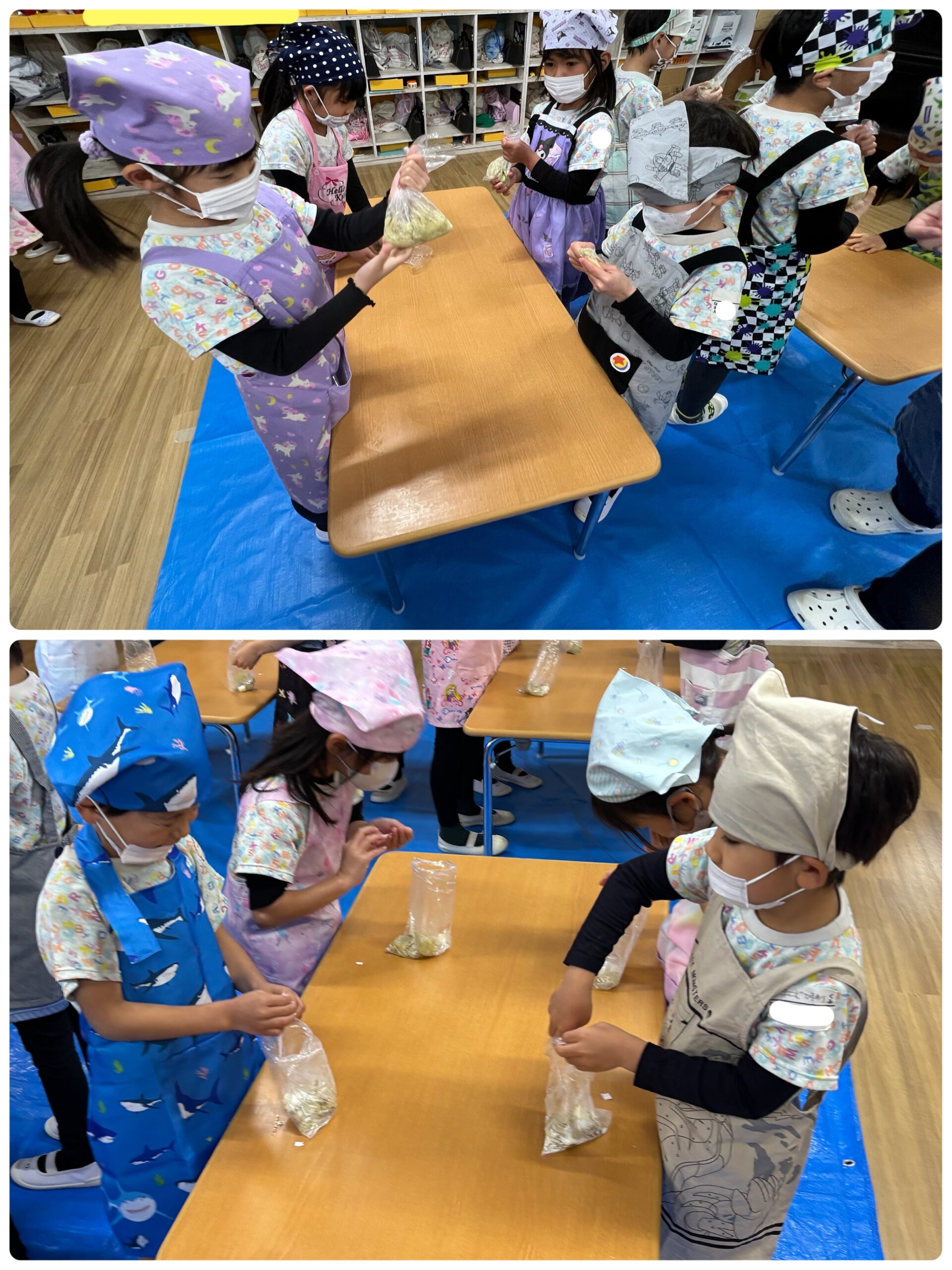 さつま芋に火を通し、袋の中でバターと砂糖を自分たちで入れて揉みこむように混ぜていきます。