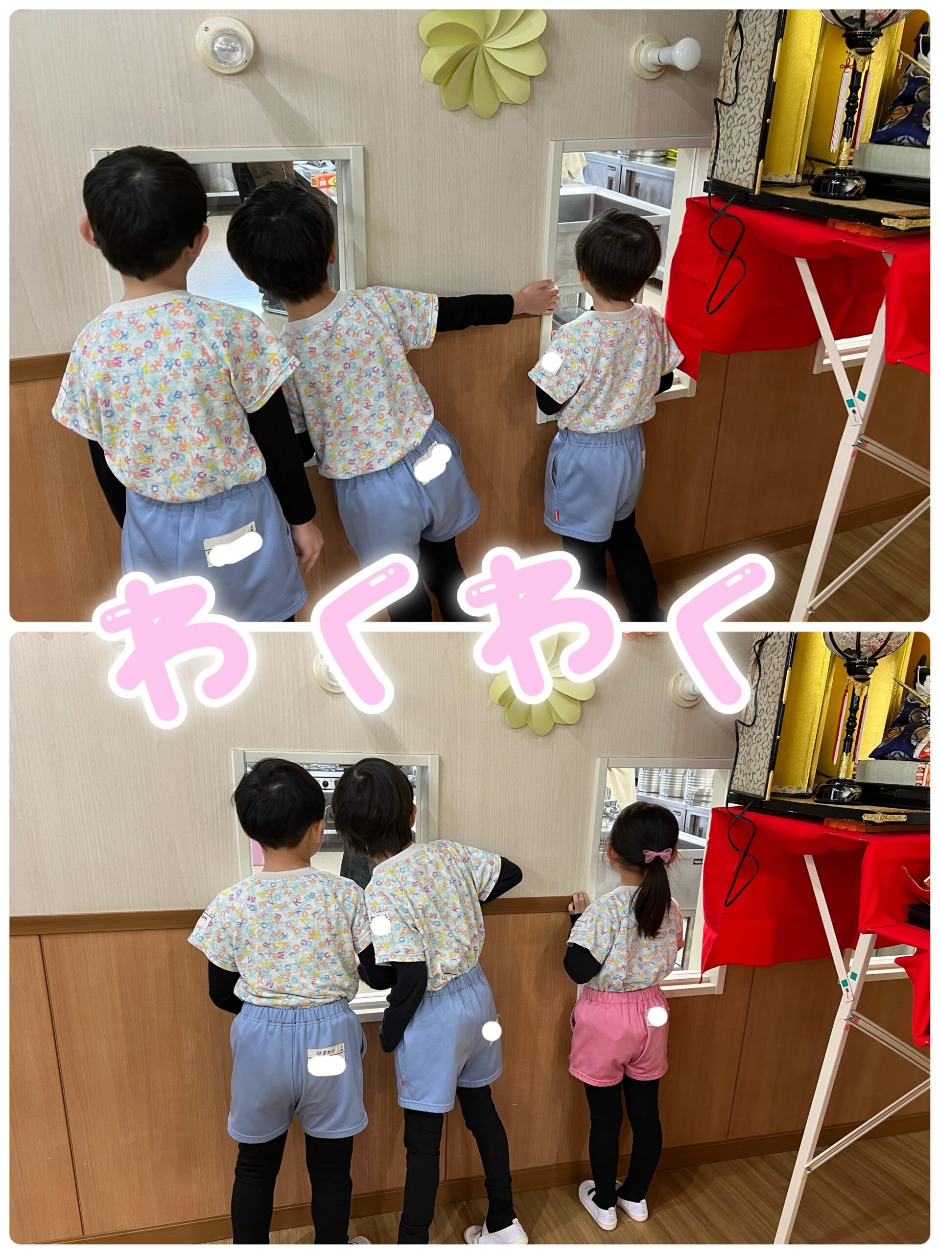 給食室の小窓から、中の様子見て楽しみにしている子どもたちです。