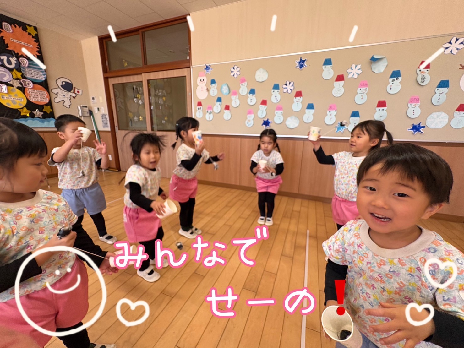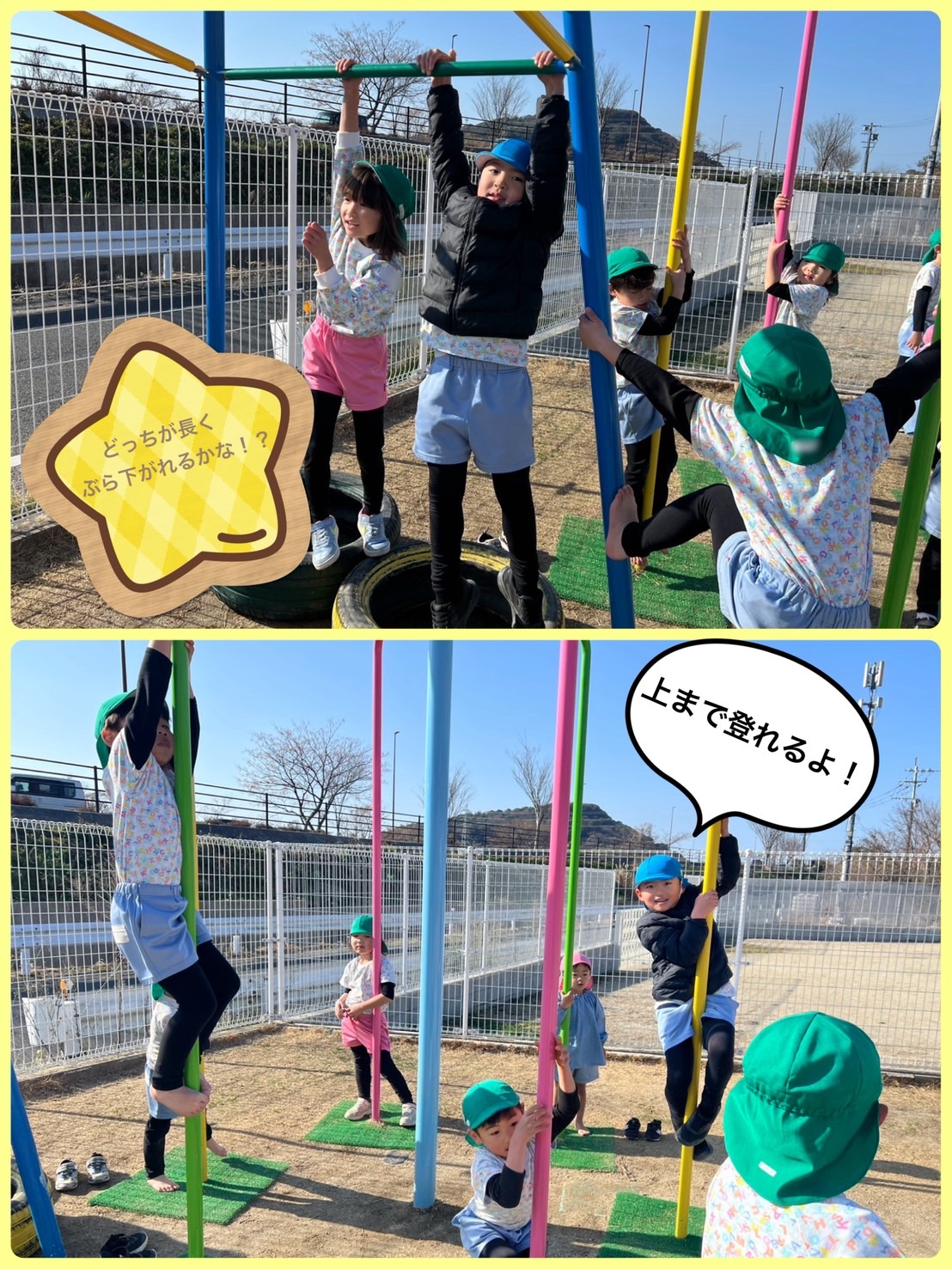 届かなかった登り棒の1番上が届くようになったり、長い時間うんていにぶら下がれるようになったりと戸外遊びを通して強い体づくりを頑張っています。