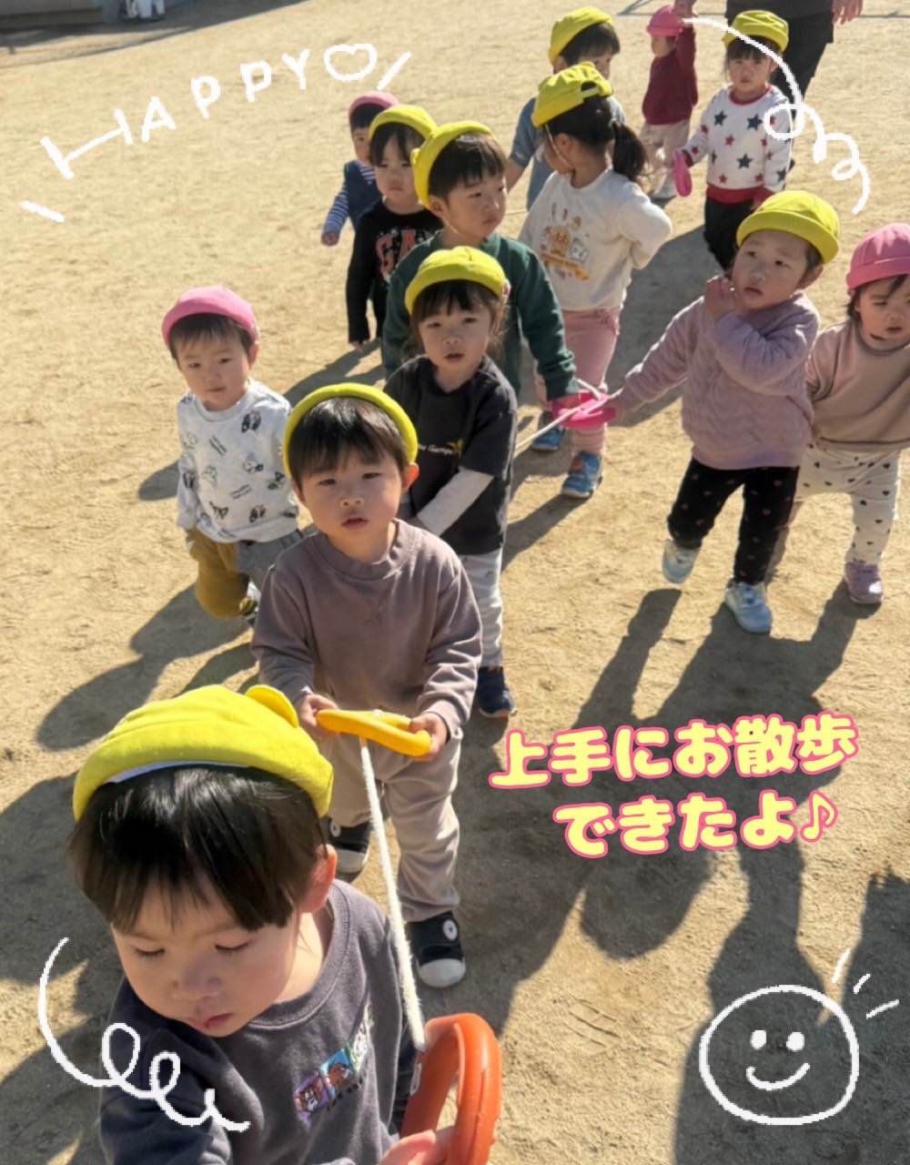 小さいお友だちは自分で靴を履くことに挑戦し、お散歩ロープをしっかり握って上手にみんなで園庭を歩きました!