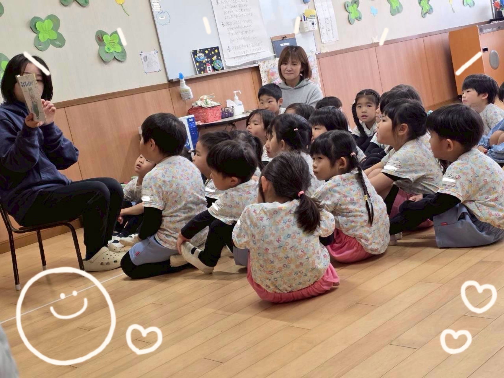 元気よく季節の歌と朝の歌を歌ったあとは、「風」にまつわる絵本を真剣に聞く子どもたち・・・実は今回行う製作のヒントになっていました。