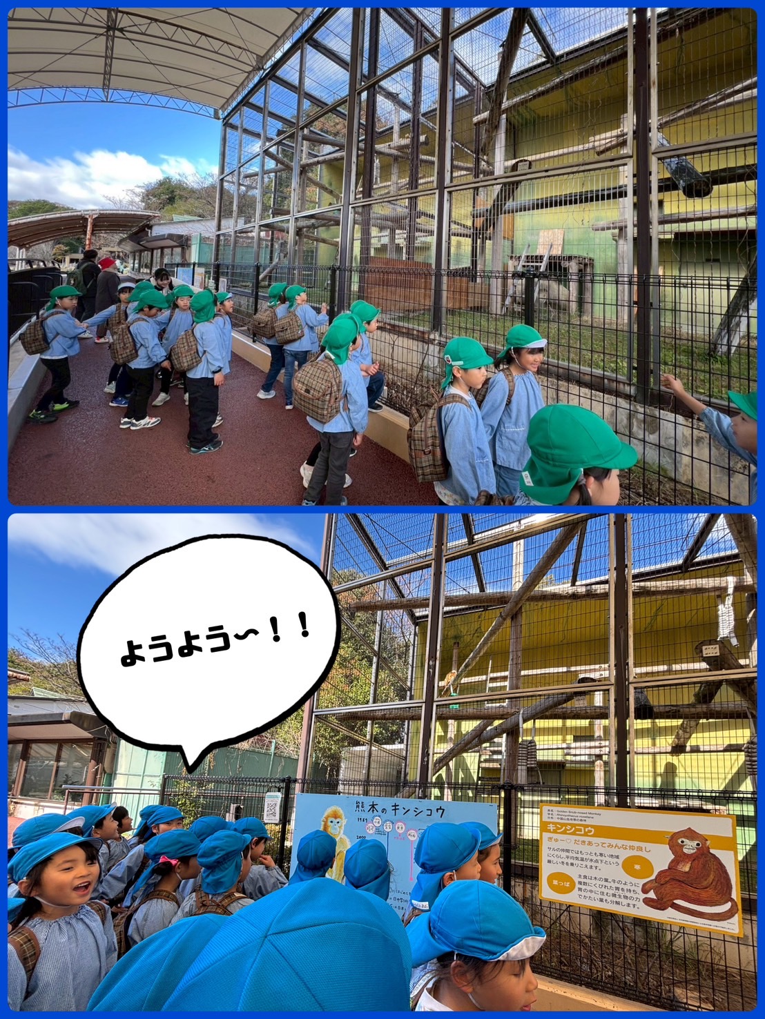そして動植物園では、日本で唯一キンシコウの飼育がされています。子どもたちもキンシコウに会えるのを楽しみにしていました。「ヨウヨウ~!」と名前を優しく呼んでキンシコウもそれにこたえるよう下まで降りてきてくれました。