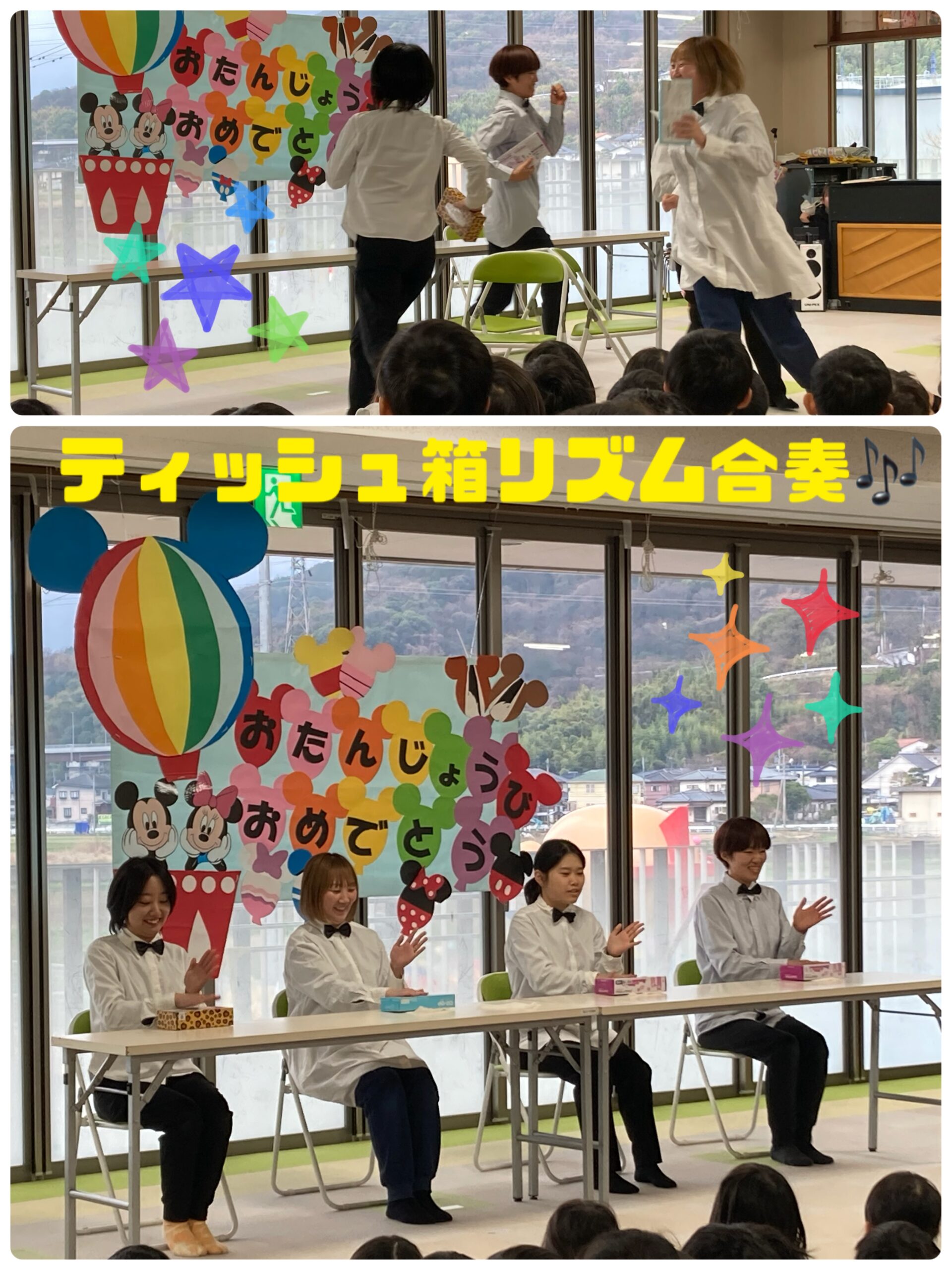そして、みんなが楽しみにしている先生たちのプレゼントは…「ティッシュ箱リズム合奏」でした!