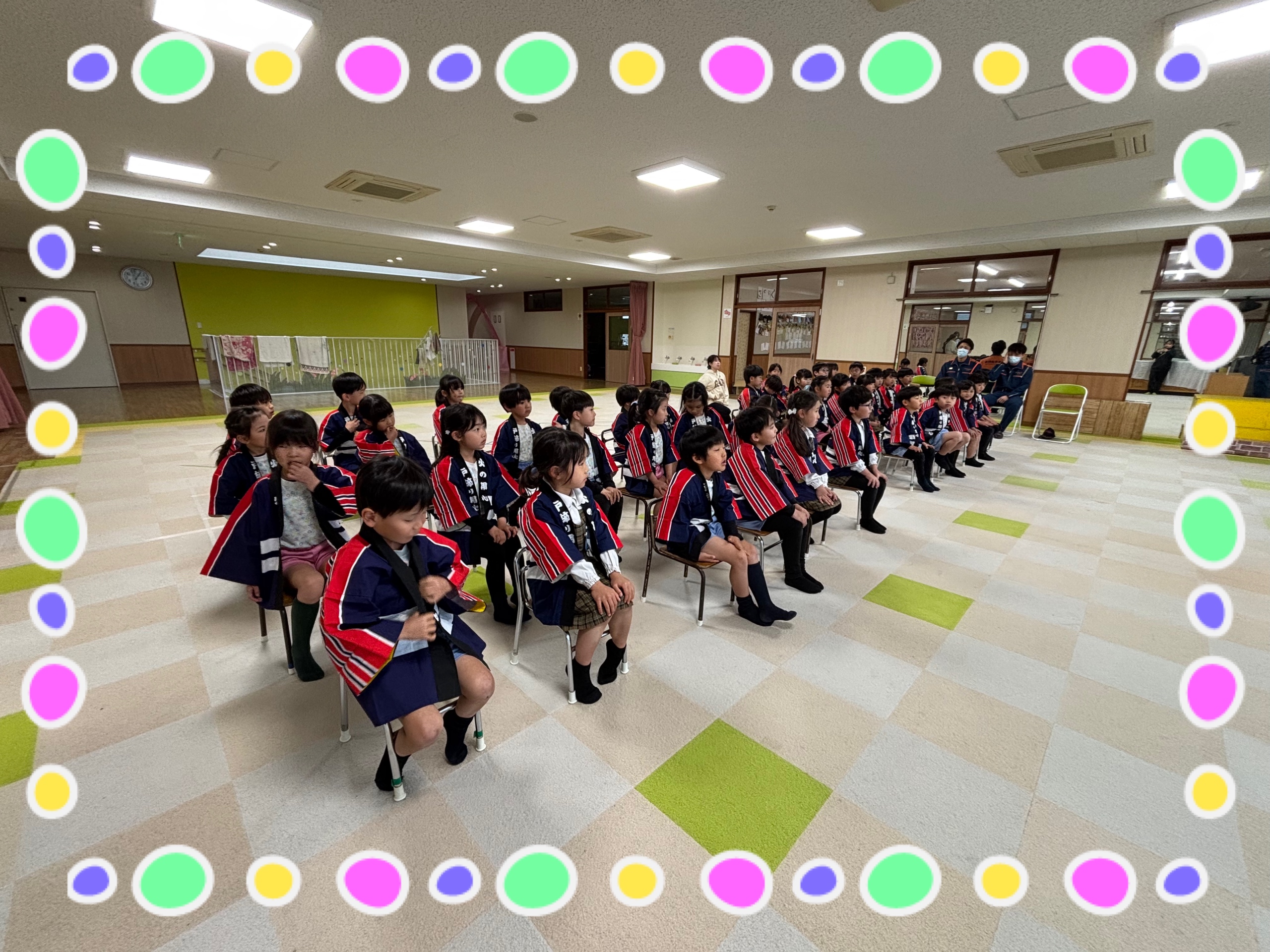今日は、田崎消防署の方々にお越しいただき年長さんが幼年消防修了式に参加しました。
