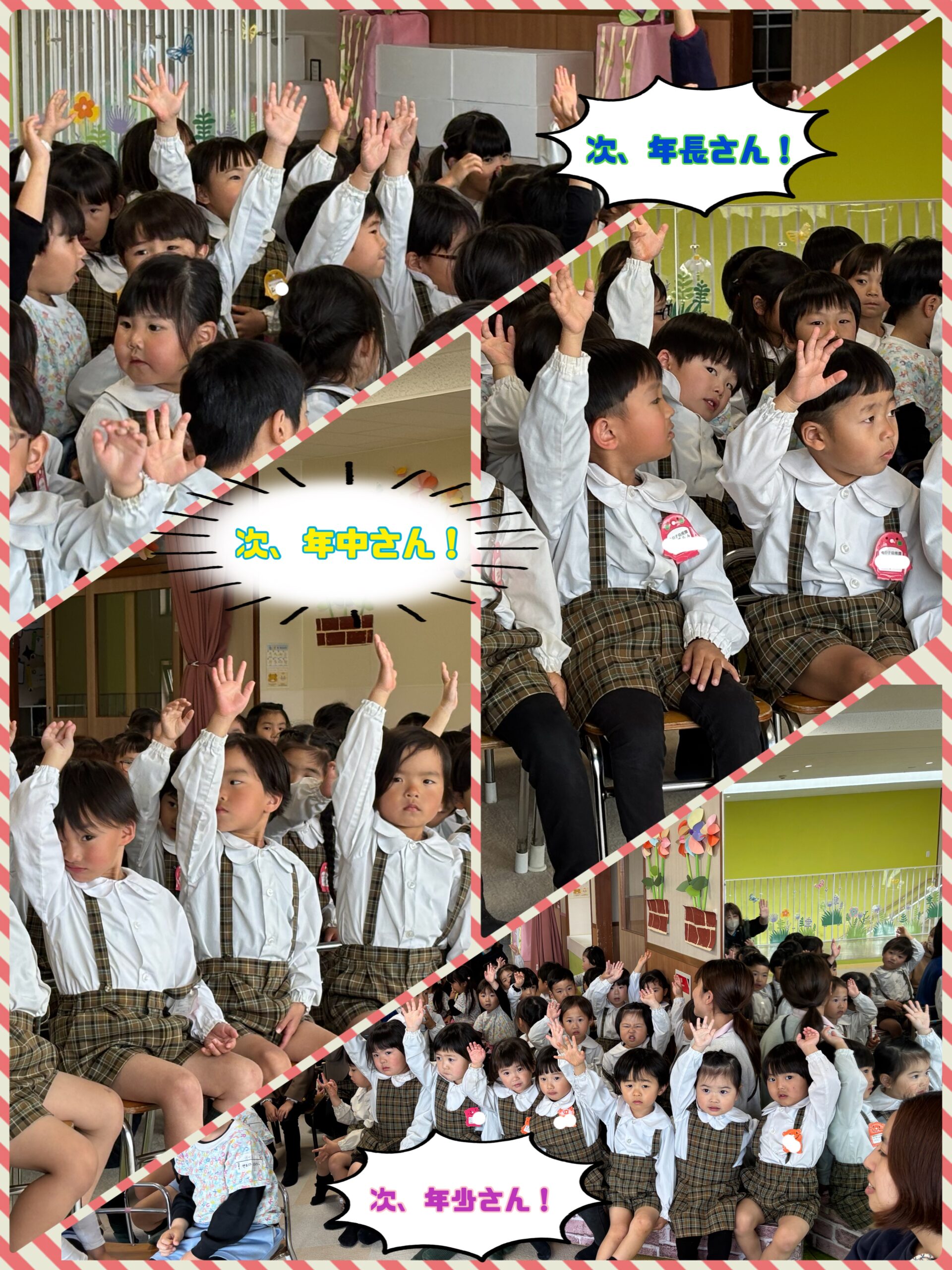 そんな目標を胸に、「四月から年長さんのお友だち!」「年中さん!」「年少さん!」の声かけに、大きな声でお返事する子どもたち。もうすでにドキドキわくわくが止まりません!