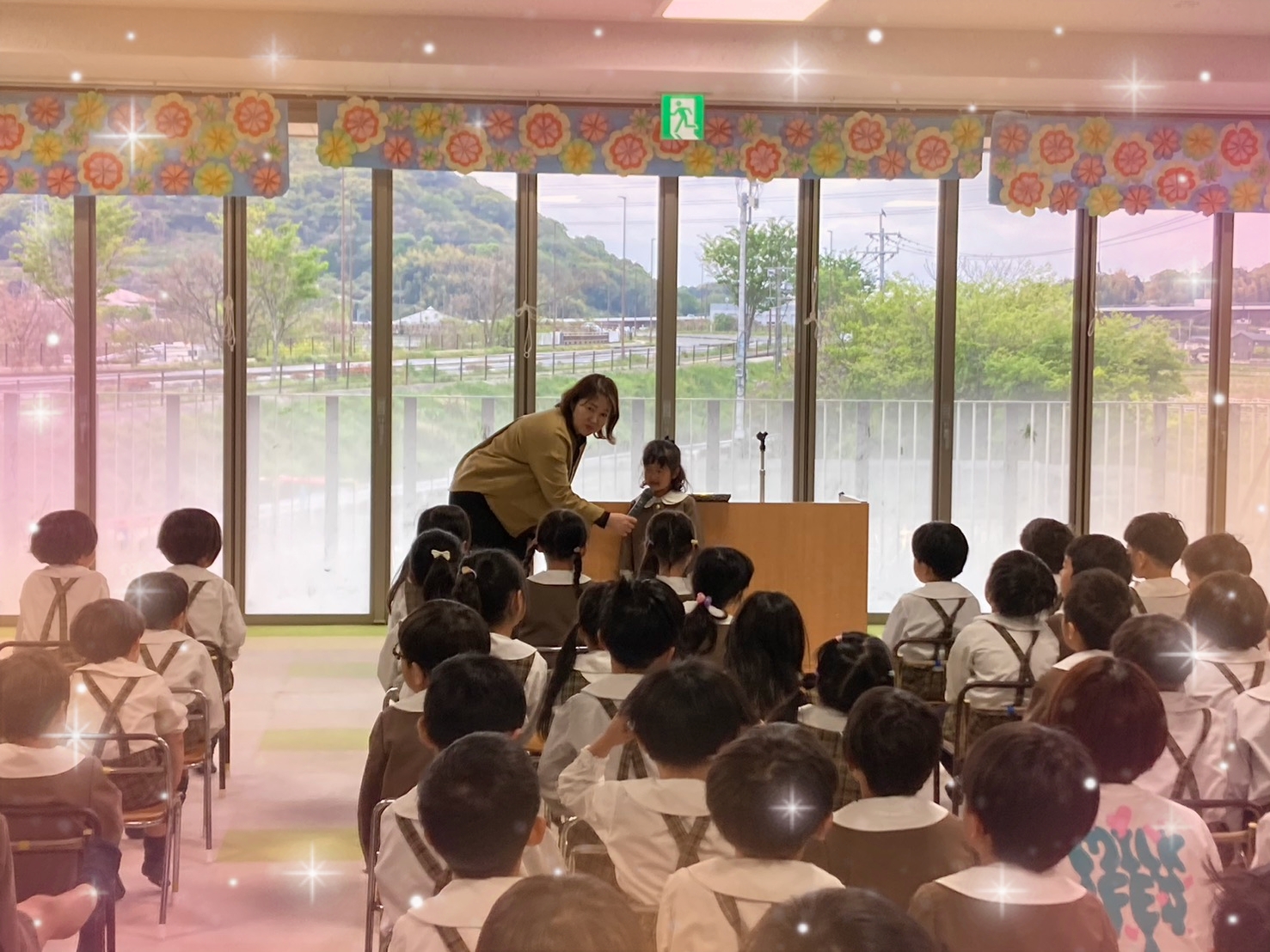 みんなで集まった始業式では、ひとつお兄さんお姉さんになり大きくなったことのお話もあり、来週からの新しいお友だちを迎えるお話をしました。