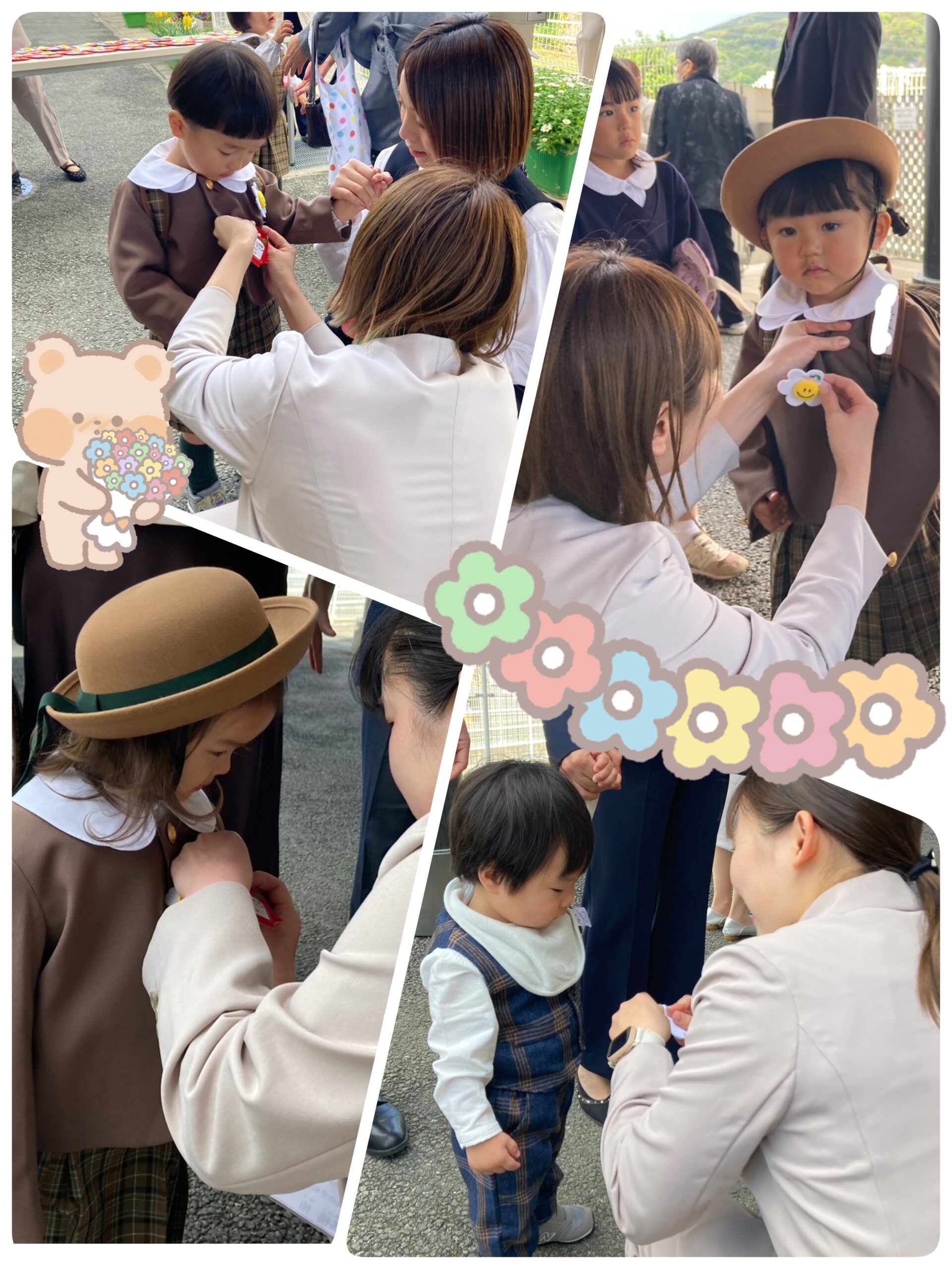 亀の子幼稚園の元気いっぱいの先生たちに迎えられて、名札とお祝いのコサージュをピカピカの制服、洋服につけてもらいました。