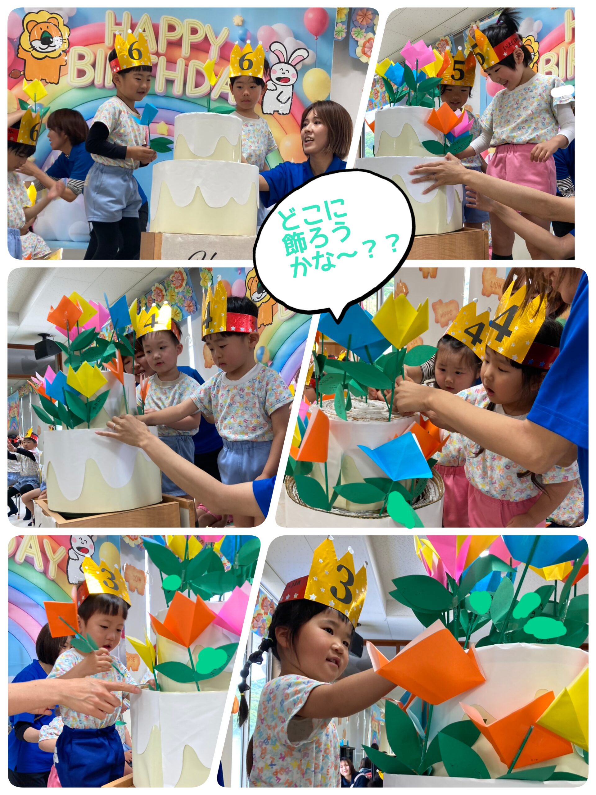 自分たちで作ったチューリップの花をケーキに飾りつけをし、ケーキを完成させました⭐️